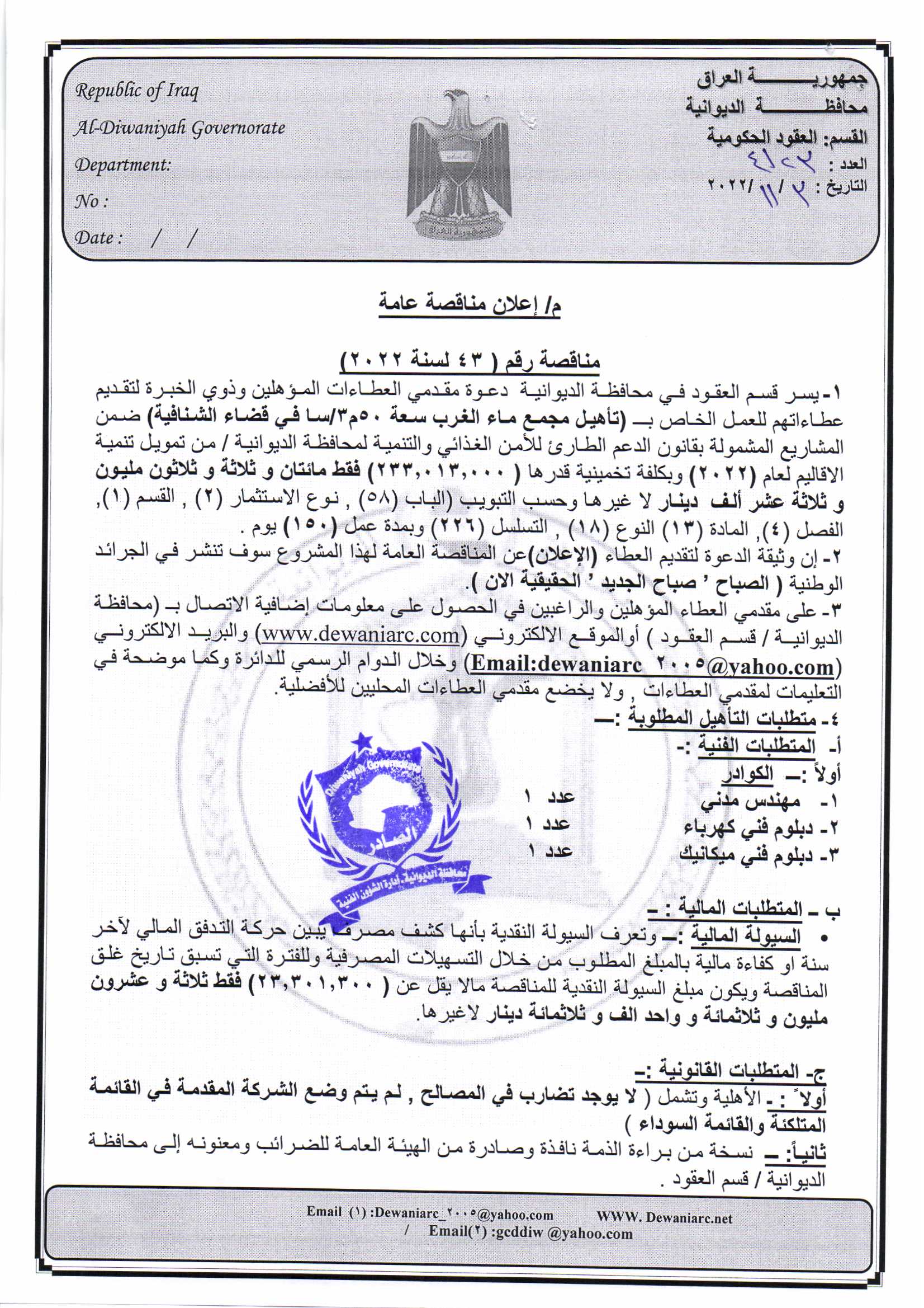﴿ إعلان مناقصة (43) لسنة 2022
