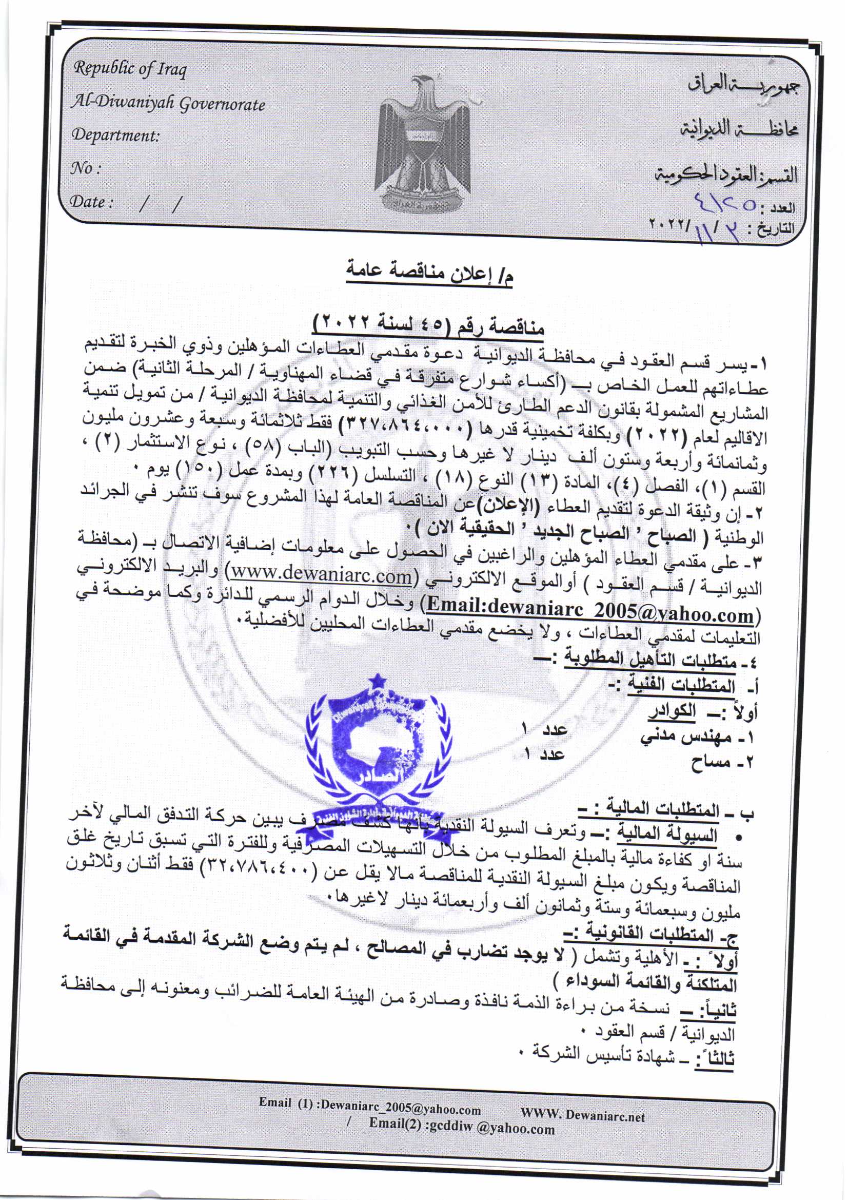 ﴿ إعلان مناقصة (45) لسنة 2022
