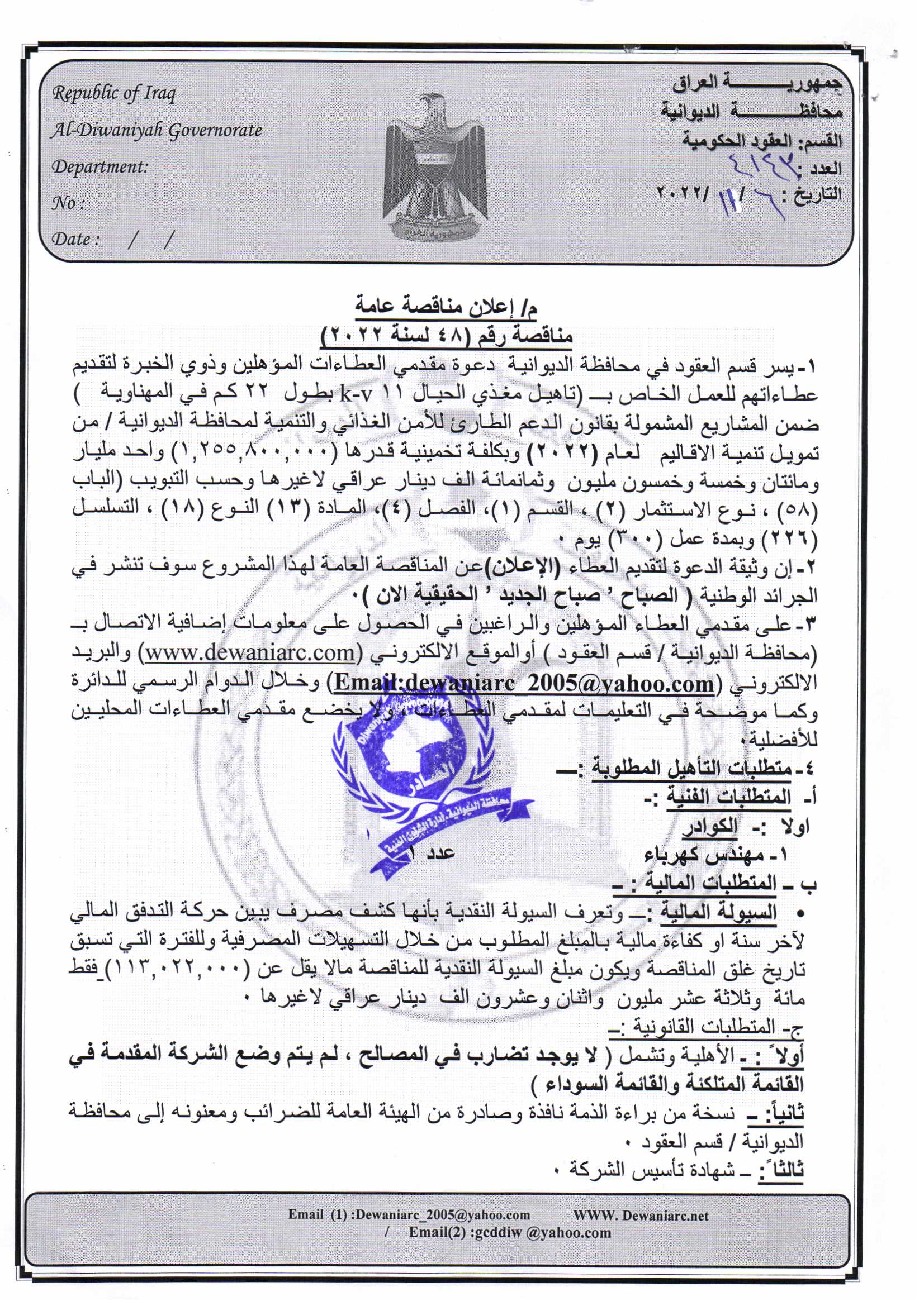 ﴿ إعلان مناقصة (48) لسنة 2022