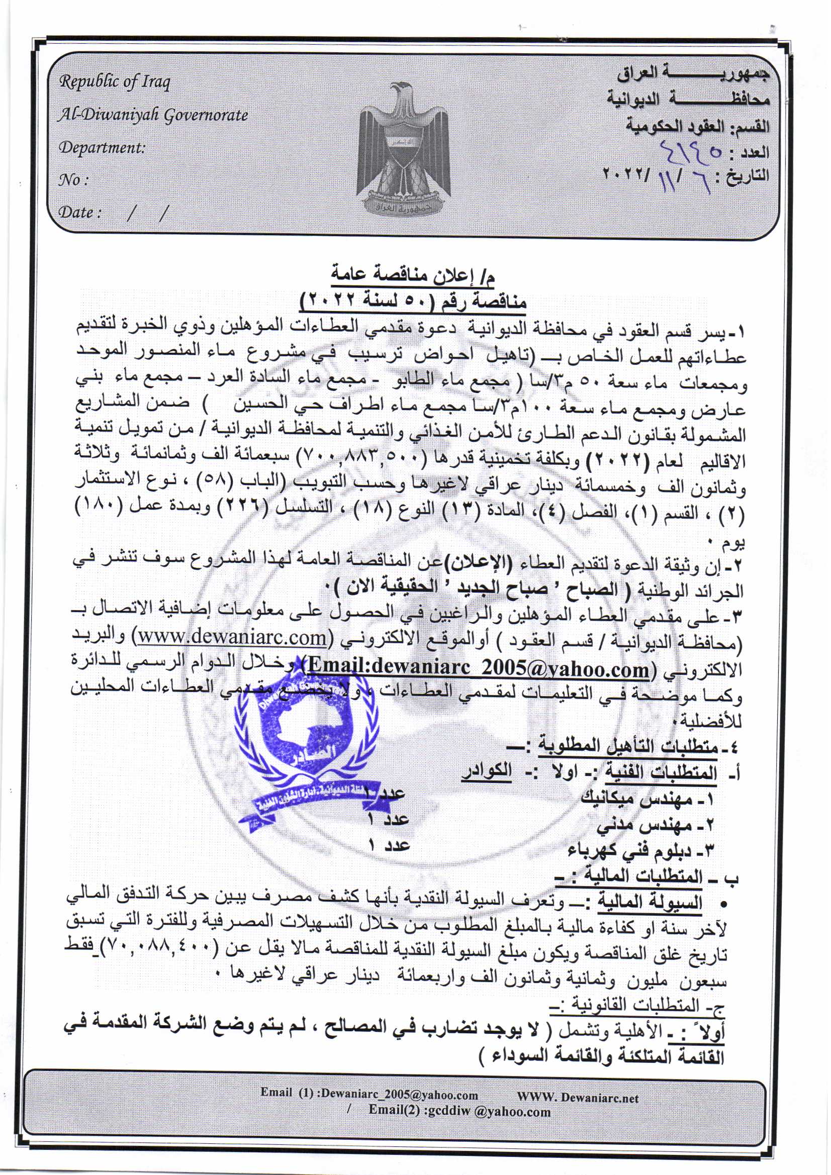 ﴿ إعلان مناقصة (50) لسنة 2022