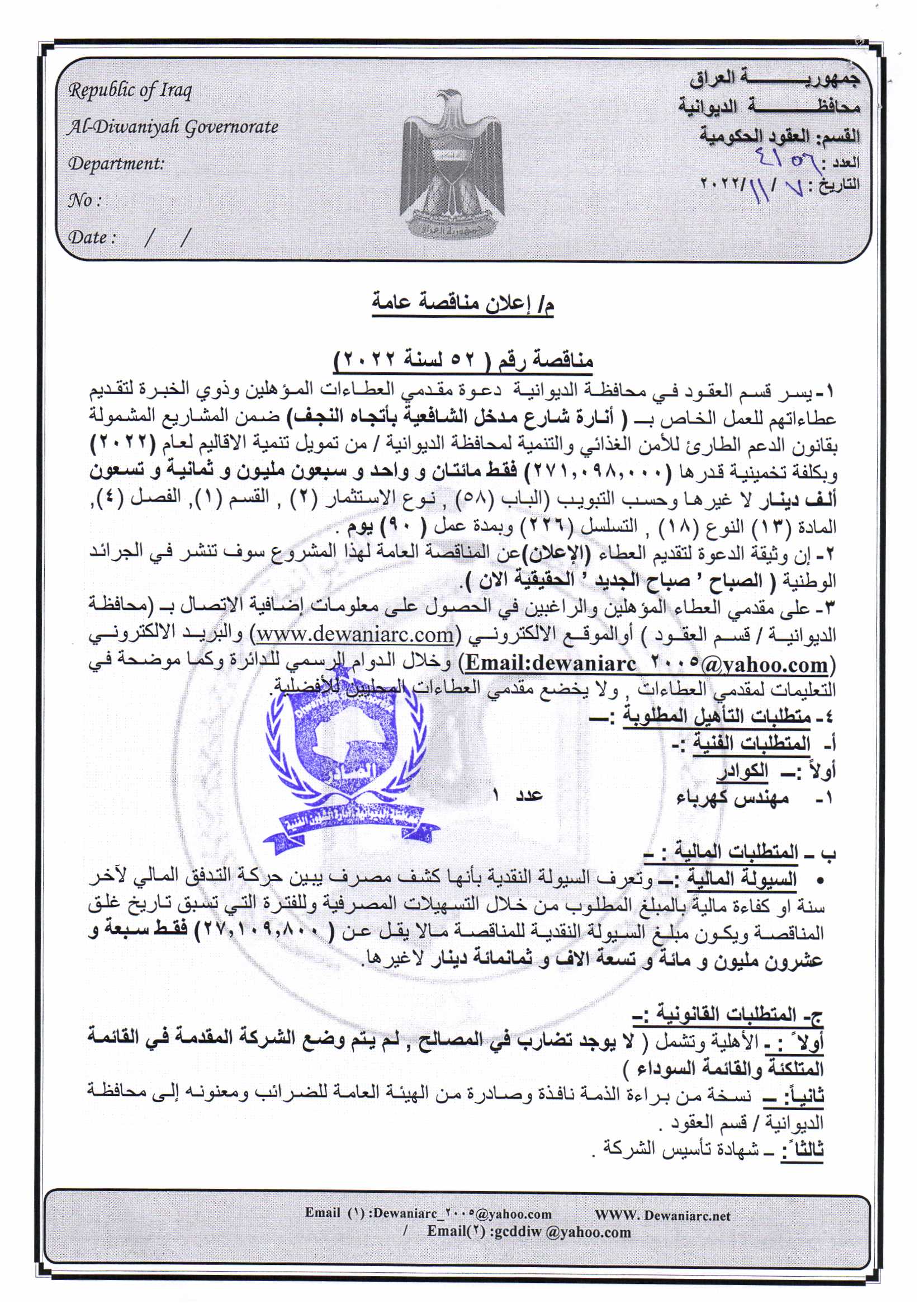 ﴿ إعلان مناقصة (52) لسنة 2022