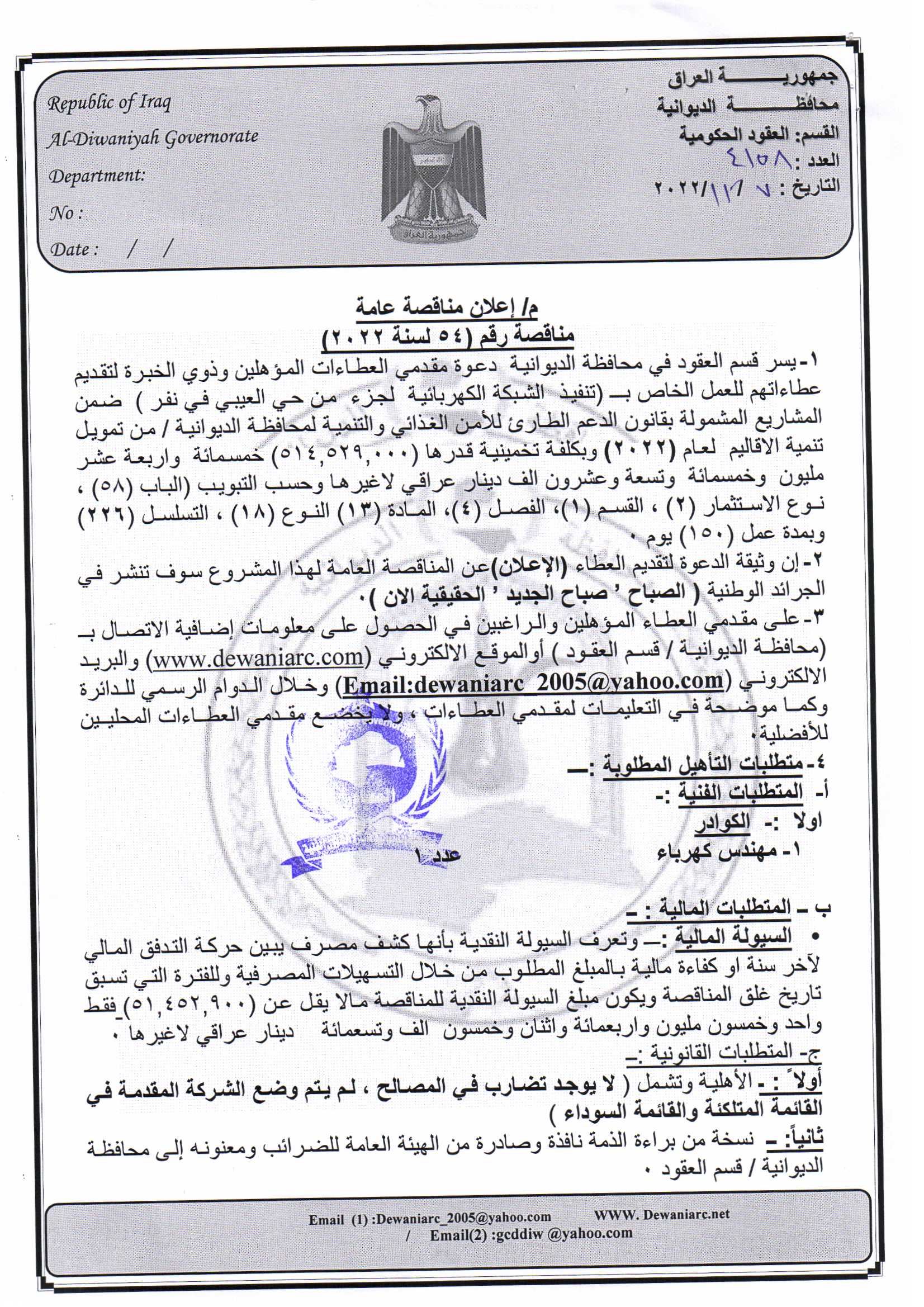 ﴿ إعلان مناقصة (54) لسنة 2022