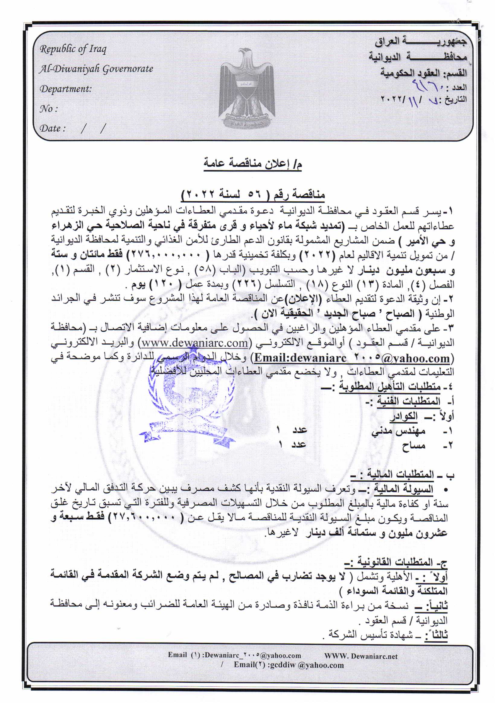 ﴿ إعلان مناقصة (56) لسنة 2022