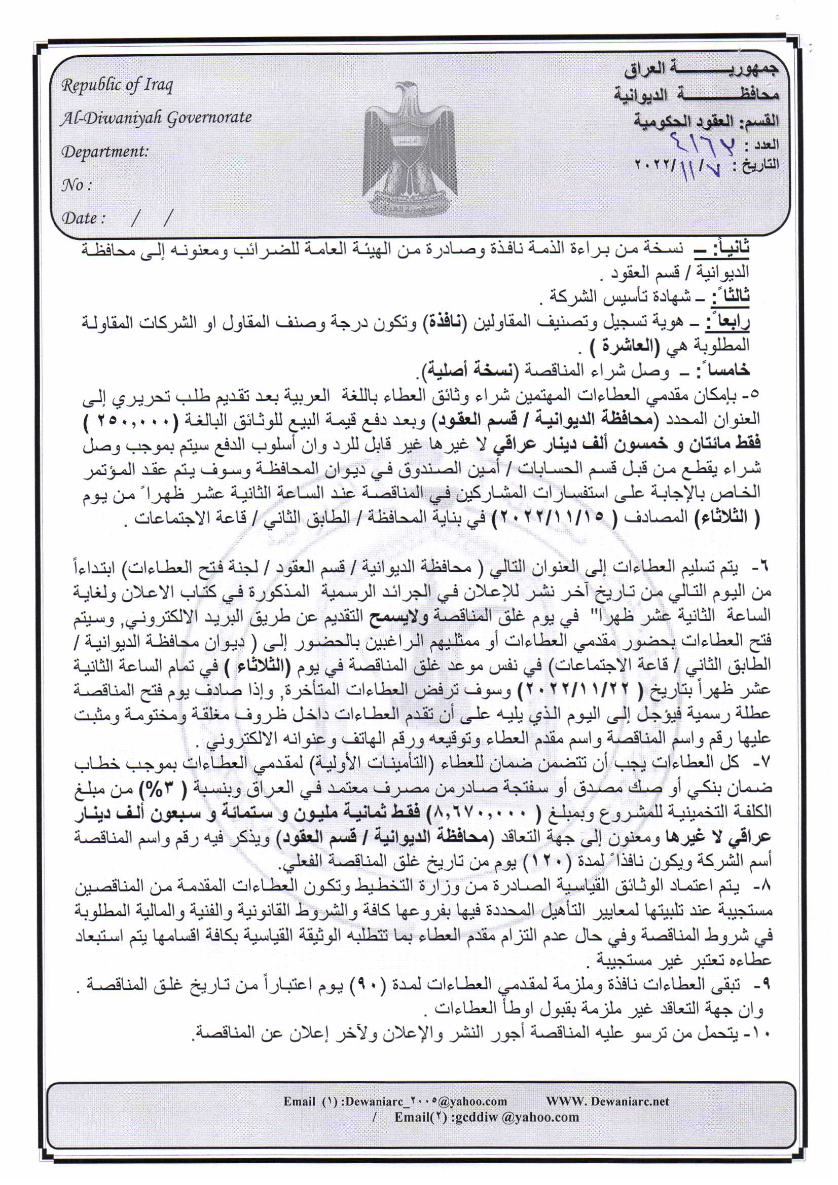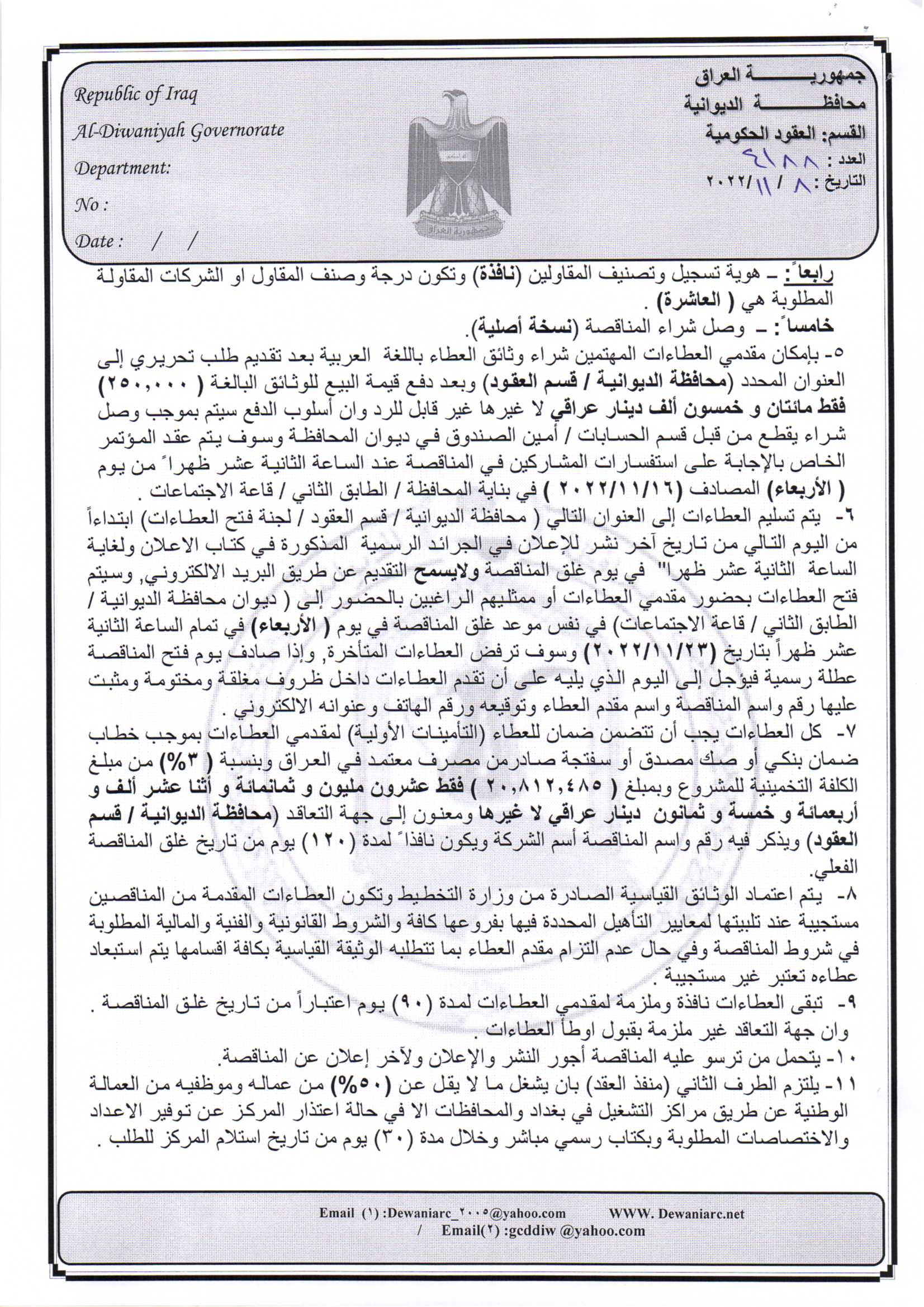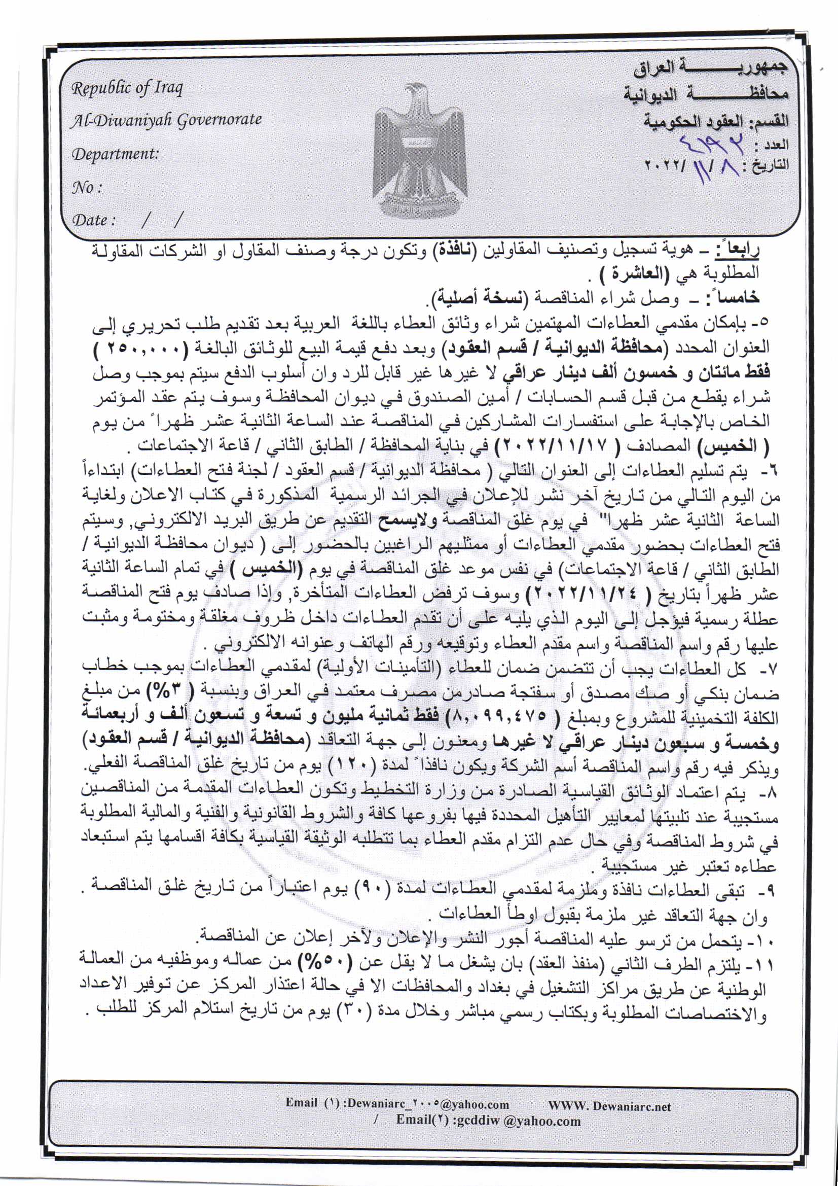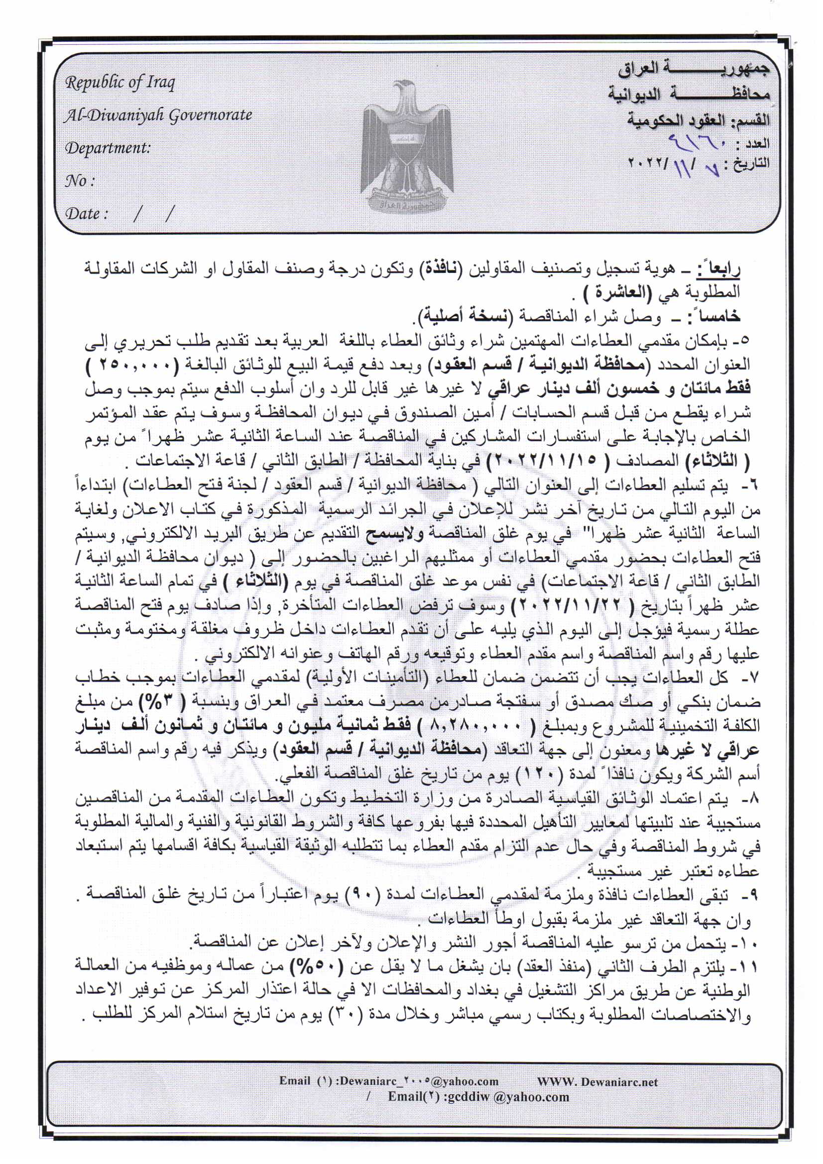 ﴿ إعلان مناقصة (8) لسنة 2022
