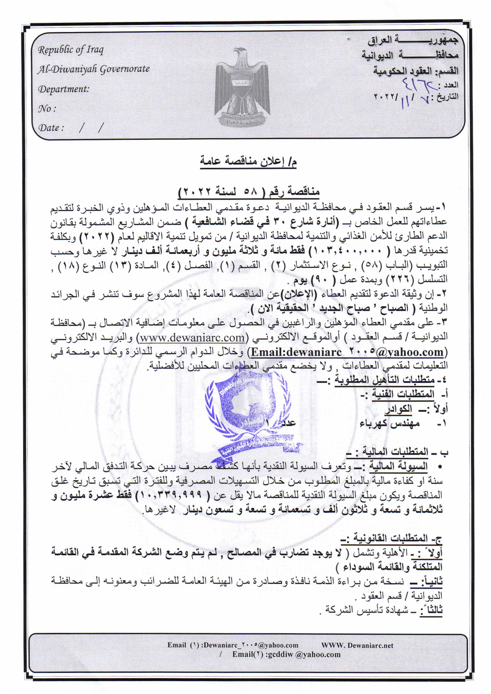 ﴿ إعلان مناقصة (58) لسنة 2022