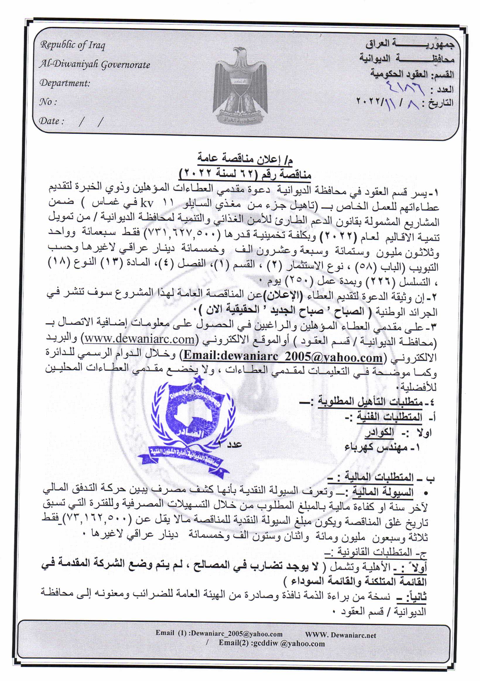 ﴿ إعلان مناقصة (62) لسنة 2022
