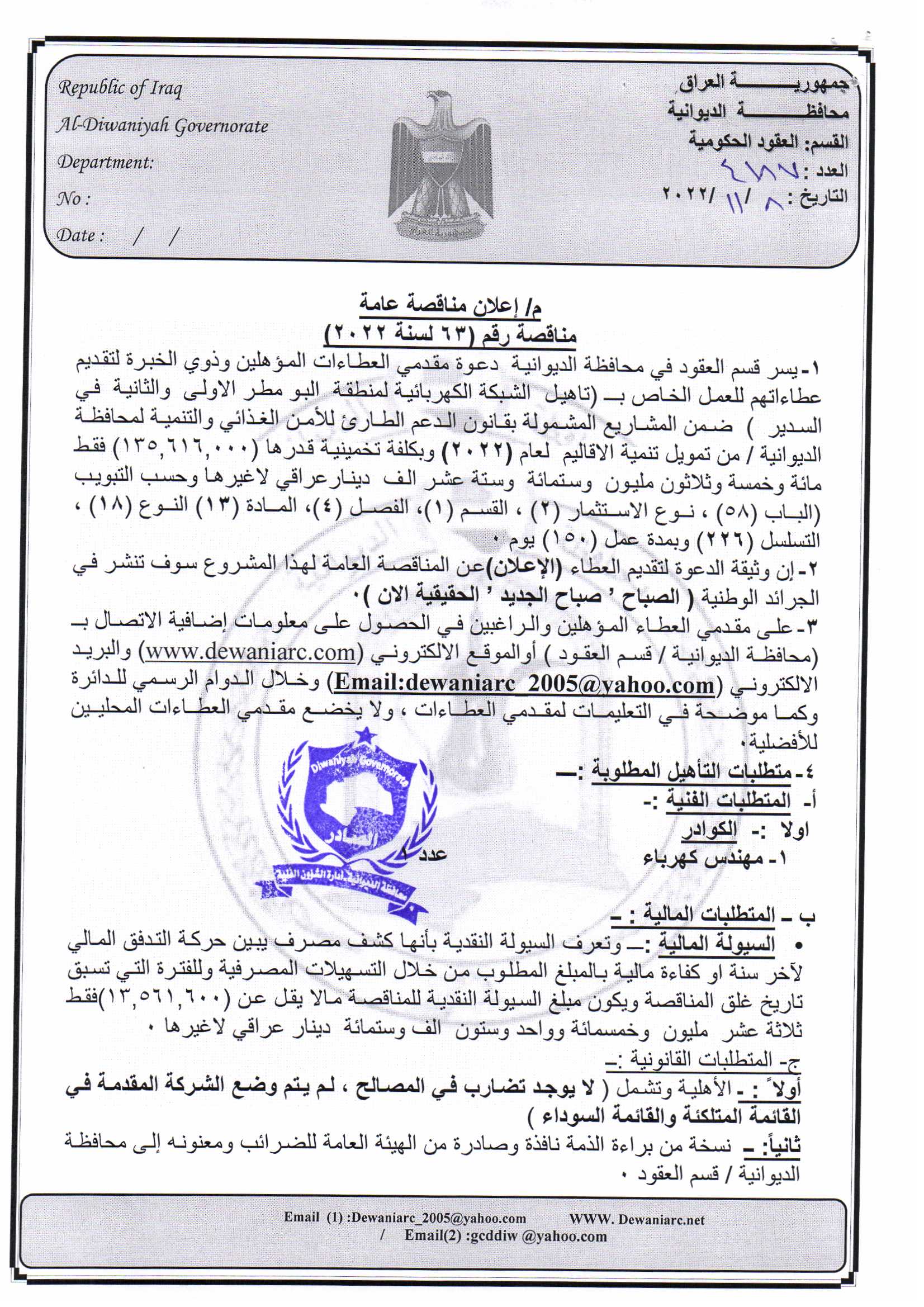 ﴿ إعلان مناقصة (63) لسنة 2022