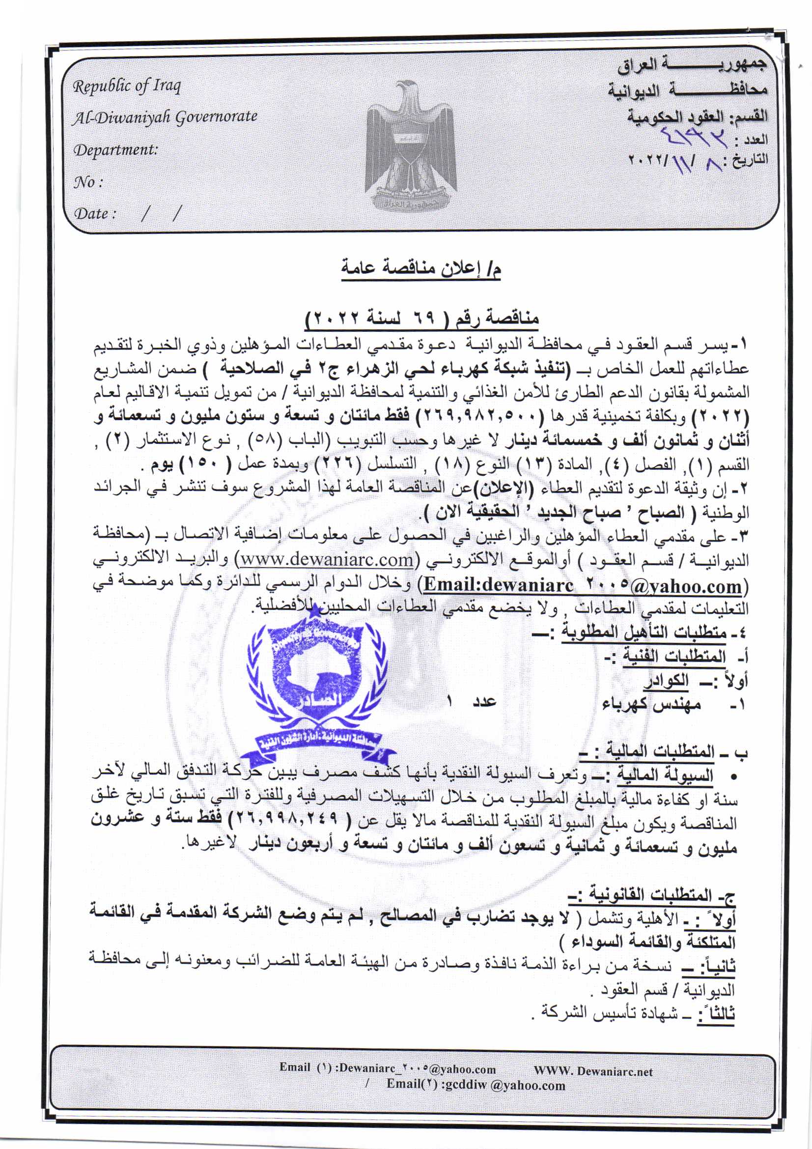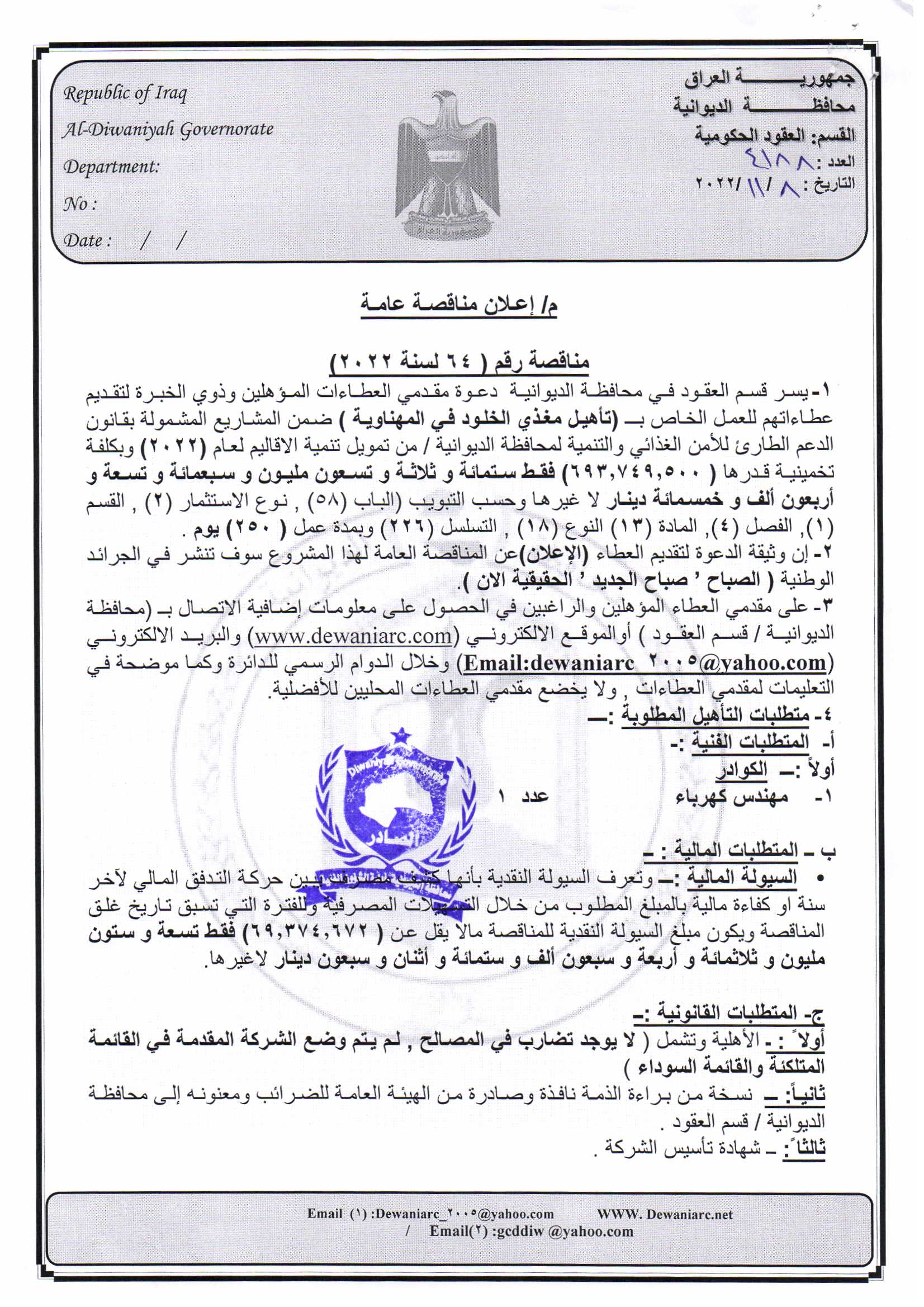 ﴿ إعلان مناقصة (69) لسنة 2022