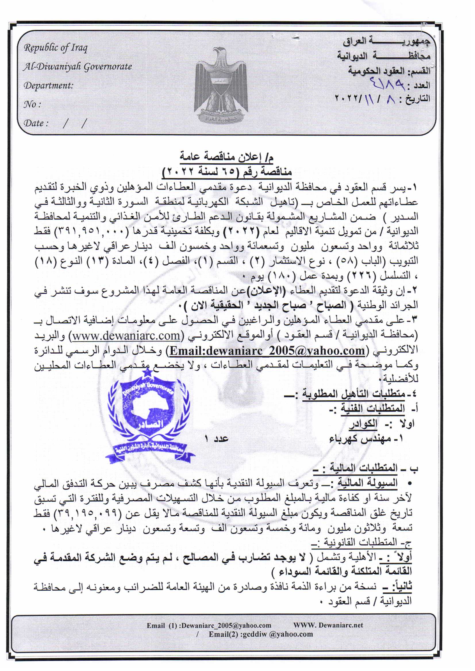 ﴿ إعلان مناقصة (65) لسنة 2022
