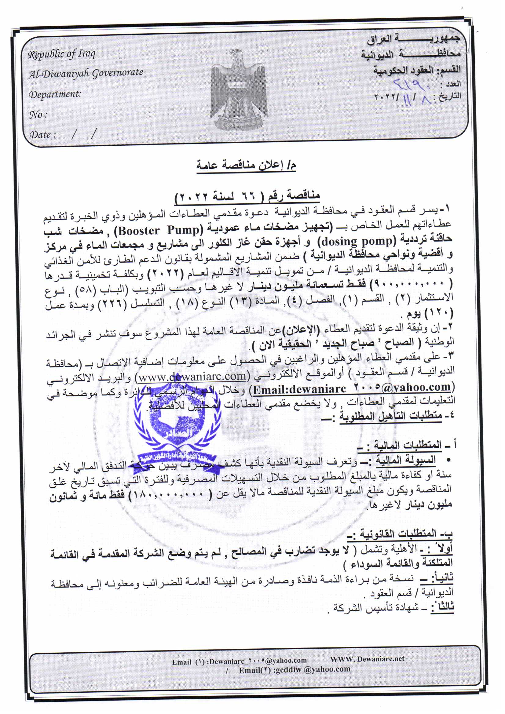 ﴿ إعلان مناقصة (66) لسنة 2022