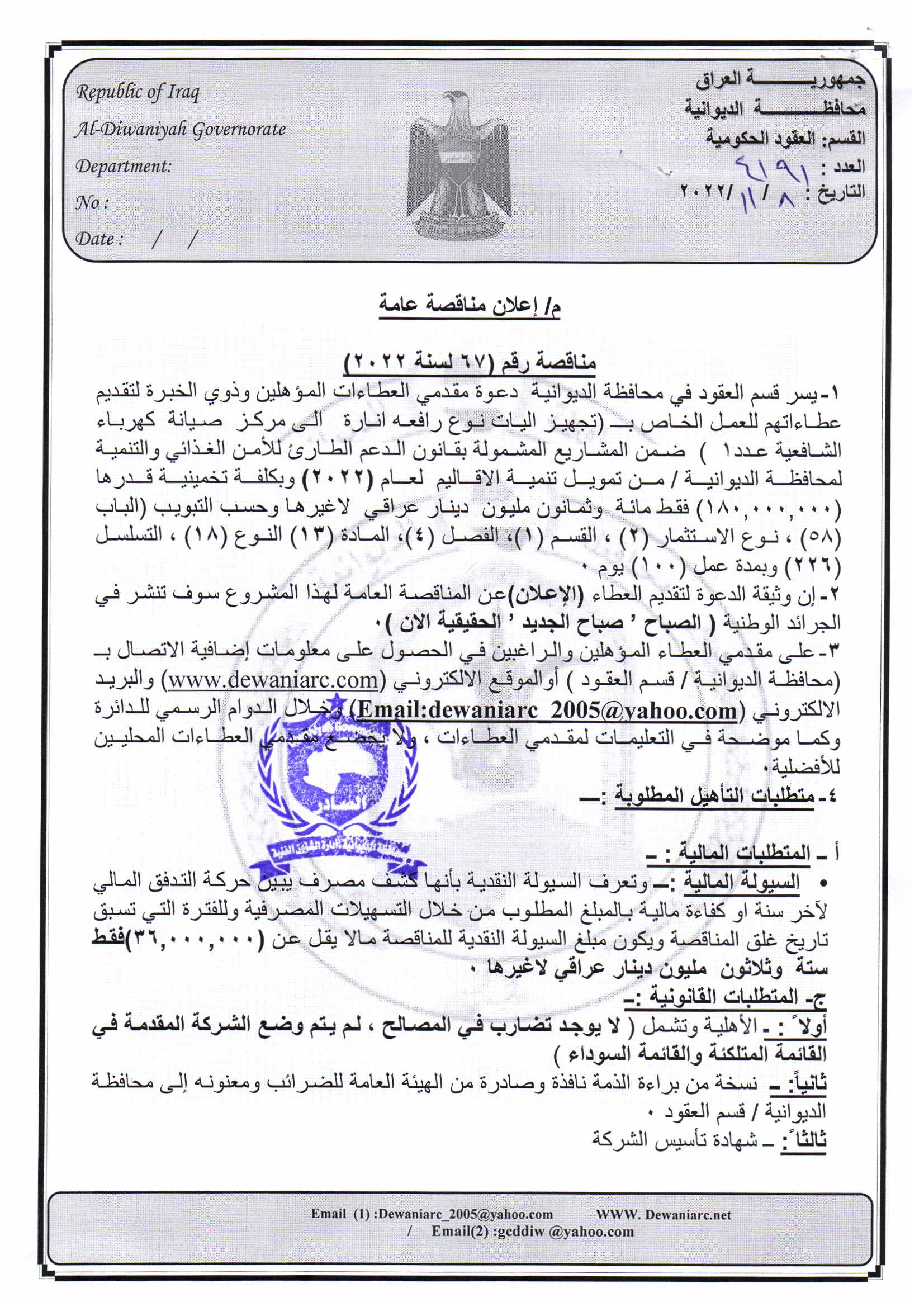 ﴿ إعلان مناقصة (67) لسنة 2022